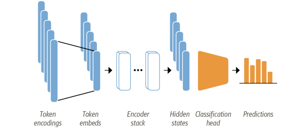 The texts are converted to embeddings before feeding them to encoder stack which will output a hidden state for each of the tokens. We can take use of hidden states to train our classifier in 2 ways: